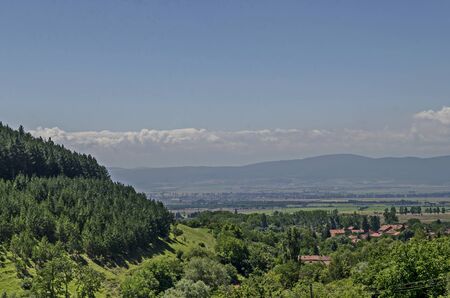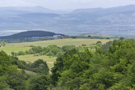 Summer scene with mountain glade, forest and residential district of bulgarian Zhelyava village, Sofia region, Balkan mountain, Bulgaria