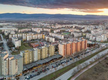 PLOVDIV, BULGARIA - FEBRUARY 4, 2021: Aerial Sunset view of Typical residential building from the communist period at district Trakia in city of Plovdiv, Bulgaria