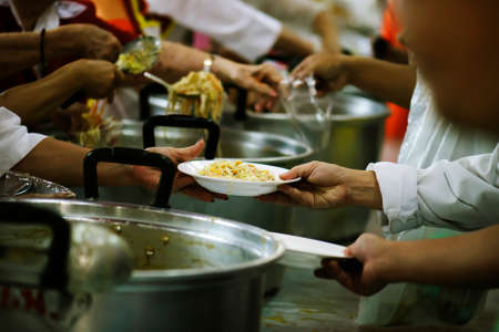 The hands of the poor receive free food from the volunteers. The concept of food sharing