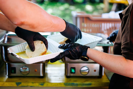 Close up view of women volunteering at food drive by serving hot meals with kindness to the homeless people. Detailed shot of female charity workers preparing food donations for the less fortunate.