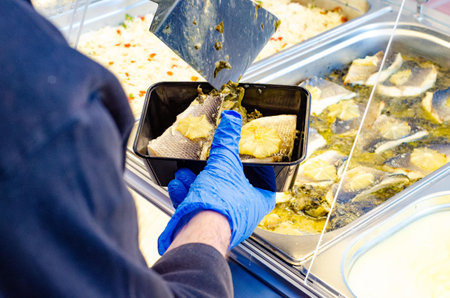 Chef preparing takeaway dish in restaurant or pub, food delivery concept, home delivery, online order
