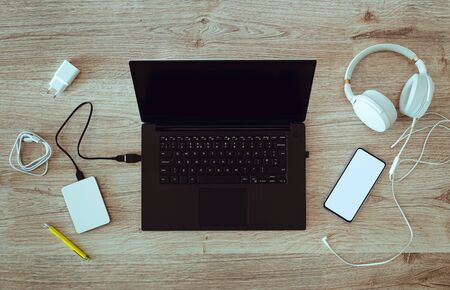 Laptop with a portable disk with connected headphones and a smartphone on the desk. Place of relaxation or work. White phone screen with place for inscription