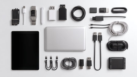 A visually appealing flat lay showcasing various technology accessories including cables, adapters, and devices, perfect for digital lifestyle and organizational themes.