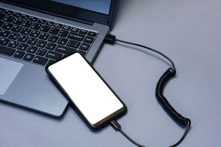 Mock-up of a smartphone with a white screen close-up being charged from a laptop on the background of a gray table