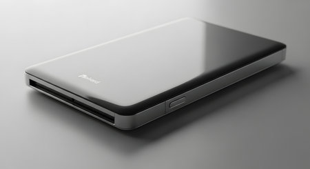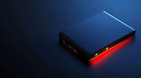 A sleek external hard drive with a glowing LED indicator sits on a dark surface, illustrating modern technology and data storage solutions in a minimalist design.
