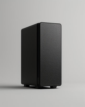 3d rendering of a black computer case with speakers on a gray background