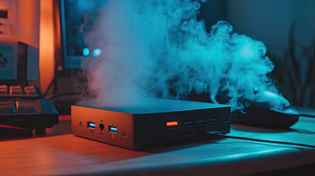 A sleek device emits dramatic smoke in a dimly lit workspace, showcasing a blend of technology and atmospheric lighting that creates an intriguing vibe.