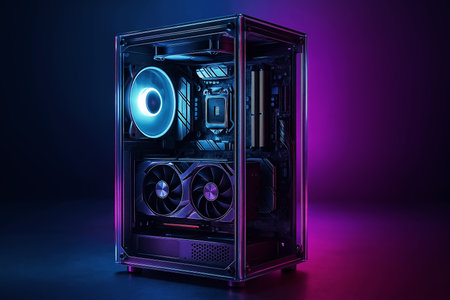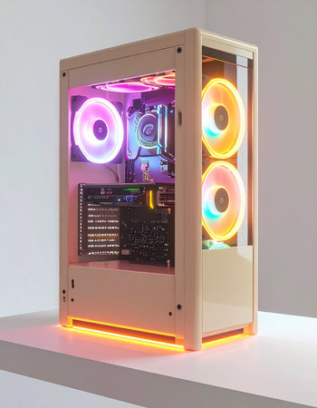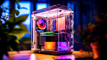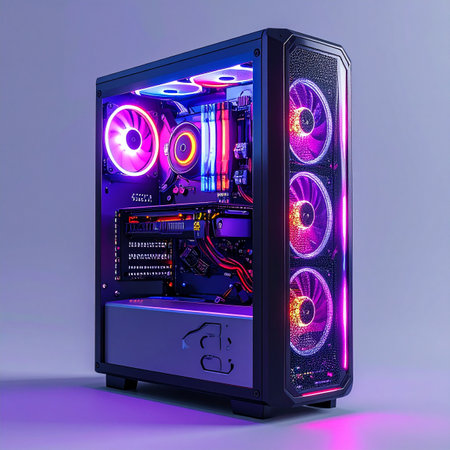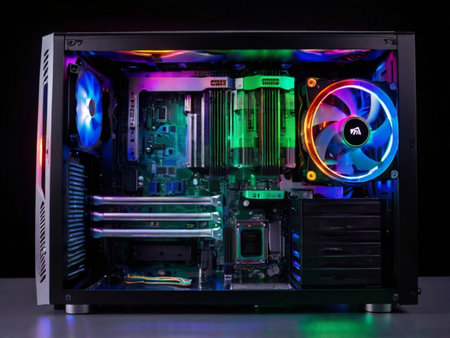 A high-performance custom gaming PC stands ready for action, its interior illuminated by a vibrant spectrum of RGB lights.