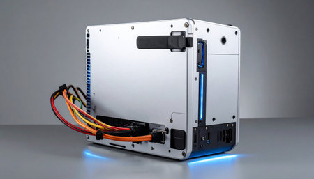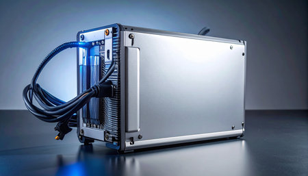 A powerful piece of industrial hardware, housed in a sleek aluminum case, glows with a cool blue light.