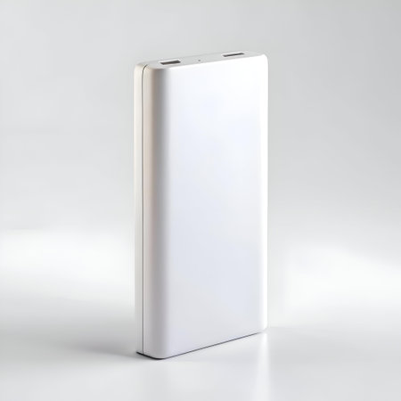 A sleek white power bank isolated against a clean. white background. This image is perfect for showcasing your power bank product or illustrating the convenience of charging on the go.