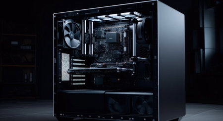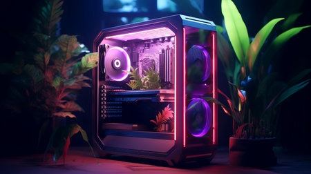 Close up of computer case on table with plant in the background. Generative AI.