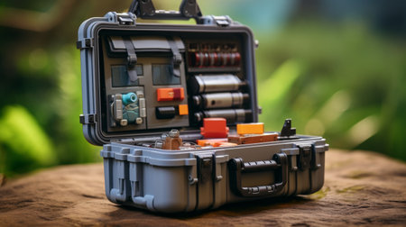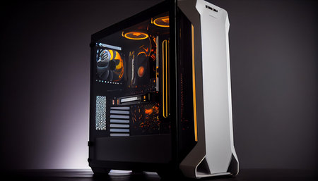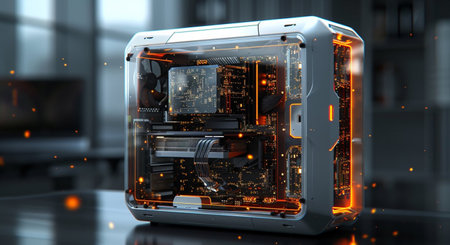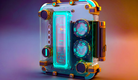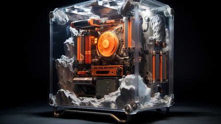 a computer case with an open top showcases various pieces inside, reminiscent of the style seen in frostpunk. the fluid glass sculptures add an orange hue to the scene, while the precision in details and high-speed sync capture the misty atmosphere. the voigtlander brilliant camera captures this unique composition. ai generated