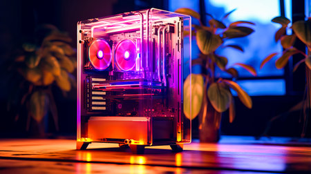 Computer case sitting on top of wooden table next to plant. Generative AI.