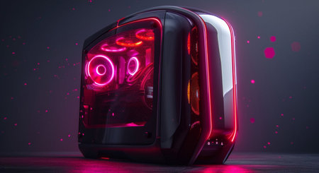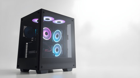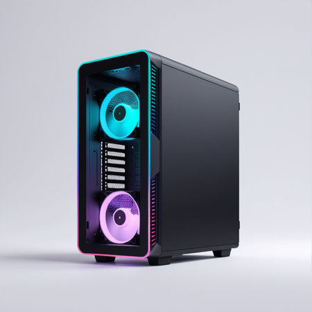 A close-up shot of a computer case with a glass side panel and colorful fans. The case is black and has a clean design.