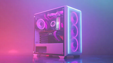 The heart of a modern battle station, this custom-built gaming PC glows with vibrant neon RGB lights. Its powerful components are on full display, ready to deliver peak performance for immersive gaming, competitive esports, and high-definition streaming.