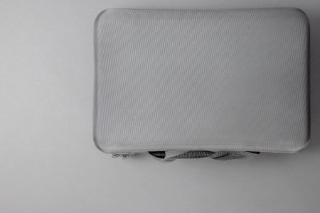 Closed gray suitcase made of fabric on a gray background. Copy space