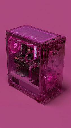 Sleek Custom Built Transparent Gaming PC Case with Vibrant Pink RGB Lighting on Minimalistic Monochrome Background AI Generative