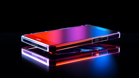 Smartphone with red and blue neon light on a black background.