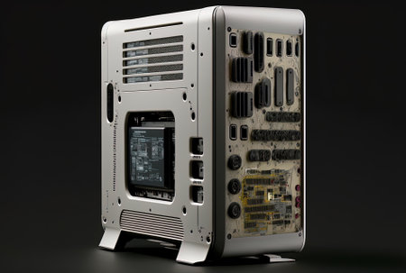 samsung exynos 6 gaming pc case featuring an industrial and product design inspired by neo-constructivism. the case showcases a sleek combination of dark white and bronze colors, with a shallow depth of field highlighting its intricate details. equipped with rtx technology, this case offers a blink-and-you-miss-it level of performance. created using daz3d software. ai generated
