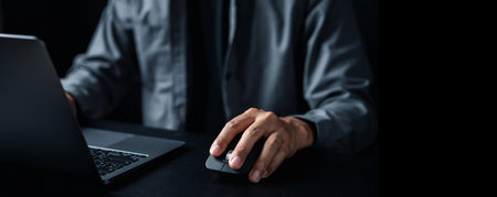 Retro image of the hand of a businessman in a suit using a wireless computer mouse on a reflective desktop against a dark background with copyspace.