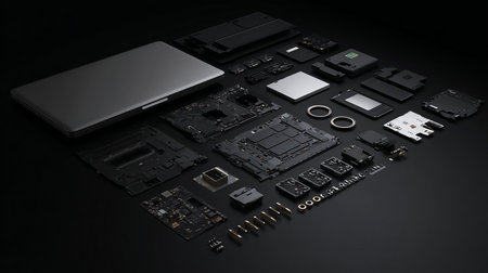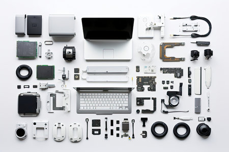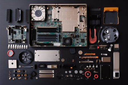 Parts of disassembled computer top view professional advertising photography