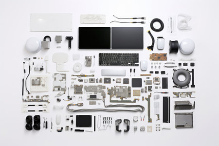 A meticulously arranged flat lay of various disassembled technology components showcasing intricate details, perfect for design inspiration and engineering projects.