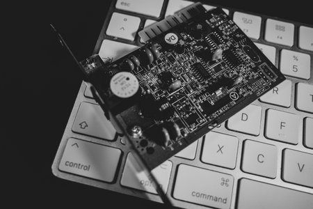 a computer board lies on a white keyboard