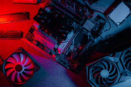 A set of parts for assembling and repairing a computer. Angle from above, everything is on the table, laid out, neon light.