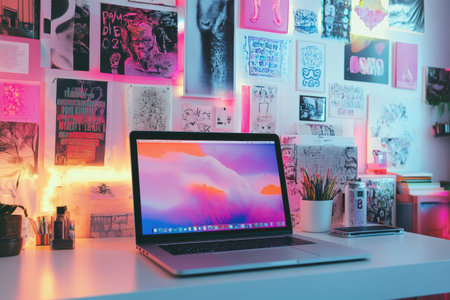 A laptop sits on a tidy desk illuminated by colorful lights, surrounded by eclectic artwork that enhances the creative atmosphere.