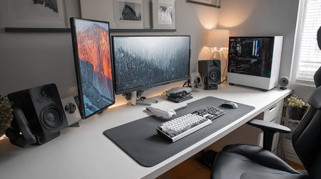 Explore a vibrant gaming setup in a cozy home office blending technology and art.