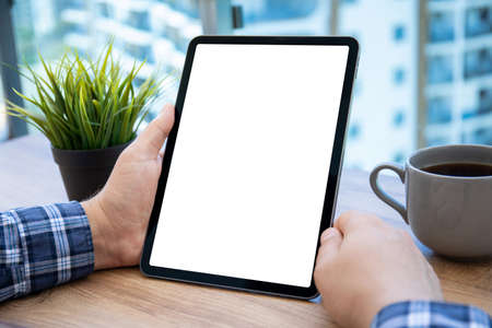 Hand holding digital tablet mockup of blank screen. Take your screen to put on advertising.
