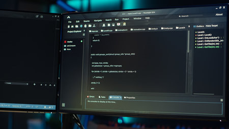 Programming code on computer monitor. Programmer working in software develop company office.