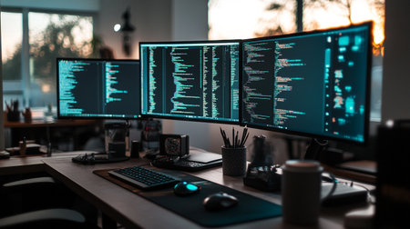 modern interior. Workplace with multi-monitor on wooden desk in office, space for text