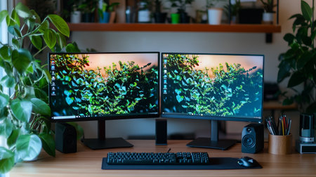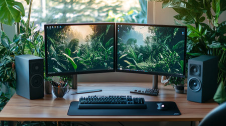 Home office with computer, keyboard, mouse, speakers and plants.