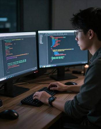 Software development, programming and coding concept. Programmer working on computer in office at night.