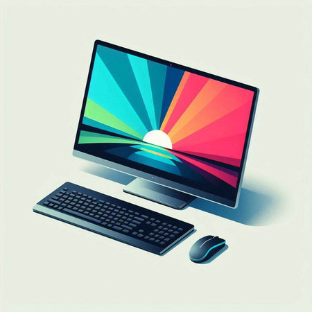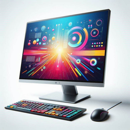 computer monitor with colorful screen and keyboard on white background. 3d illustration