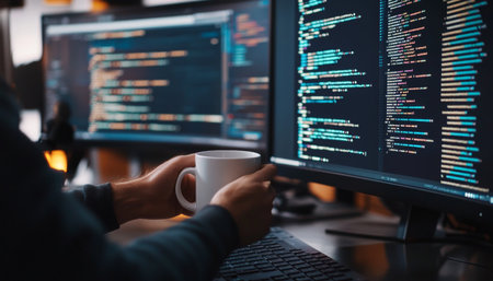 Close up of a hand holding a mug while coding on multiple monitors in an office environment