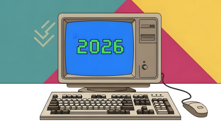 Background showing vintage computer with 2026 display and colorful geometric background...