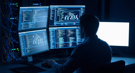Programmer working on computer in server room at night. Program typing code.