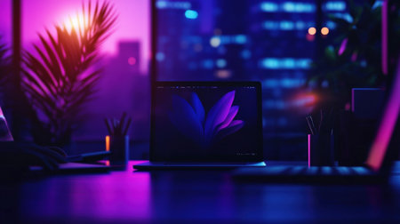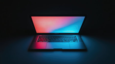 Laptop on a dark desk with RGB lighting, portraying a gaming or programming workspace in a moody, atmospheric setting.