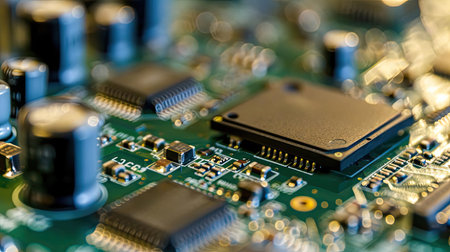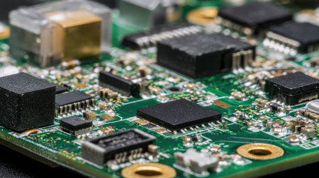 A detailed macro shot of a green printed circuit board (PCB), revealing the complex arrangement of microchips, resistors, capacitors, and conductive traces. This image is symbolic of modern technology, electronics, computer hardware, and intricate engineering.