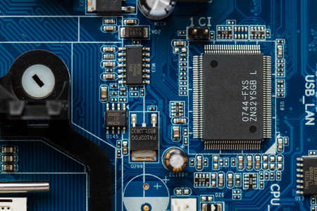 Close up photo of blue PC circuit board. Technology background.
