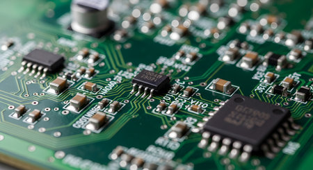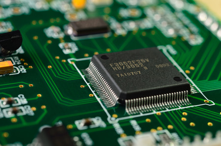 close-up circuit board with electronic components on green printed