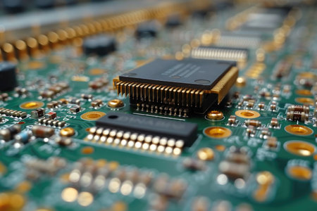 Detailed macro shot of electronic circuit board with microchips and technology components