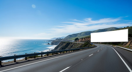 A wide, empty billboard sits on the right side of a curving highway overlooking a rugged coastline and the vast blue ocean under a bright, clear sky.