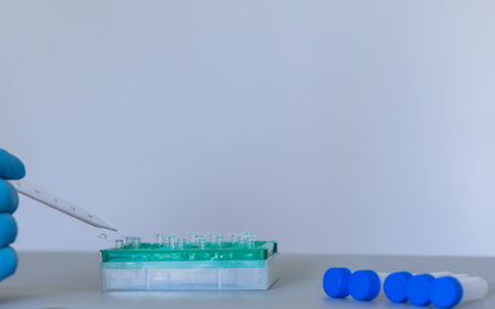 Chemical or biologe laboratory equipment - womans hands in white latex gloves holding block of test tubes with tweezers under a holder.