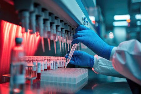 A researcher working with a pipette in a modern laboratory setting with various equipment.