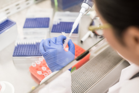 Stock photo of unrecognized scientist filling test tubes in the laboratory.