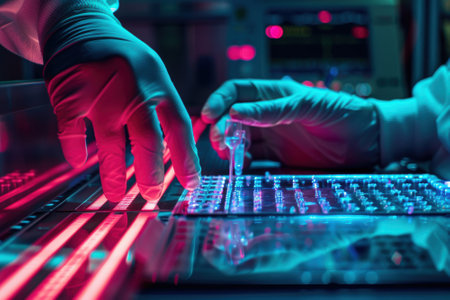 A close-up view of advanced laboratory equipment with colorful backlighting, emphasizing technological innovation in a modern research facility dedicated to scientific analysis and medical diagnostics.