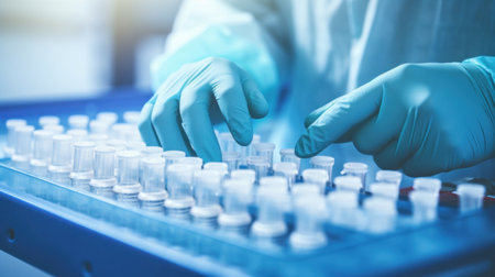 Close up hands of specialist wearing sanitary gloves check blue medical vials on a production line at a pharmaceutical factory. pharmaceutical research and manufacturing concept.